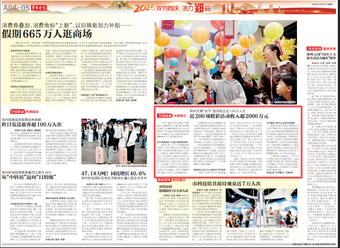 “苏轼”“杜甫”等历史人物穿越而来,与观众吟诗作对,在古今对话中传递文化韵味……郑州博物馆的“月满山河·共团圆”中秋云游夜活动让不少观众感受到了不一样的中秋夜;而郑州商代都城遗址博物院在城隍庙举办的拜月活动,按照“迎月、奠月、拜月、宴月”的传统仪轨,让市民亲身体验中秋文化的深厚底蕴——今年“双节”假期,系列文博活动大胆创新,通过沉浸式体验、互动式参与,让历史文化以更加生动的方式走进大众。