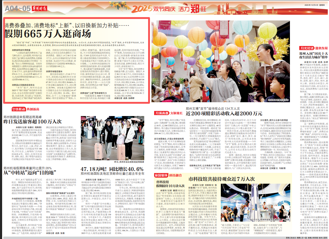 “国庆”逢“中秋”,“双节同框”下的郑州消费市场处处洋溢着蓬勃生机。10月8日,记者从郑州市商务局获悉,“双节”期间,全市消费市场活跃,生活必需品价格稳定,主要商业综合体、大型商超、餐饮企业和特色商业街区客流量及销售额保持稳定增长,成为承接消费的主要场所。