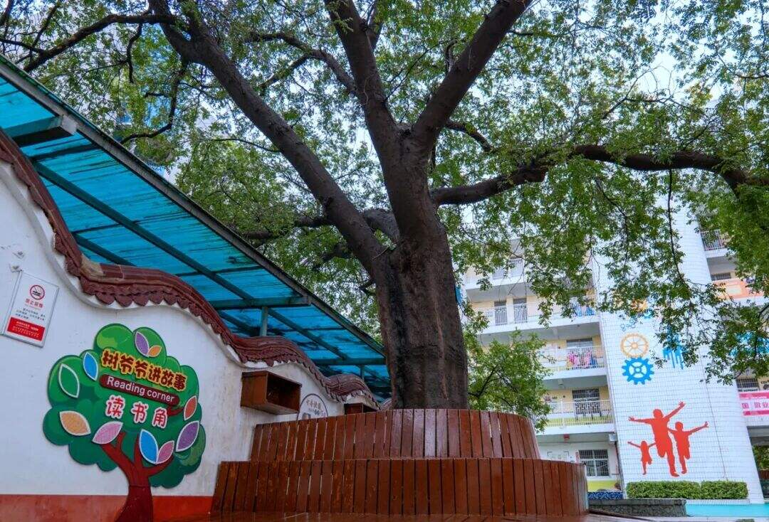 为了让孩子们能够和古树亲密接触,学校在树的周围设置了步行的栈道,又围着树干做了一圈长凳,在树边的墙上放置了书架,200岁的古树下,成了学生们的读书角。