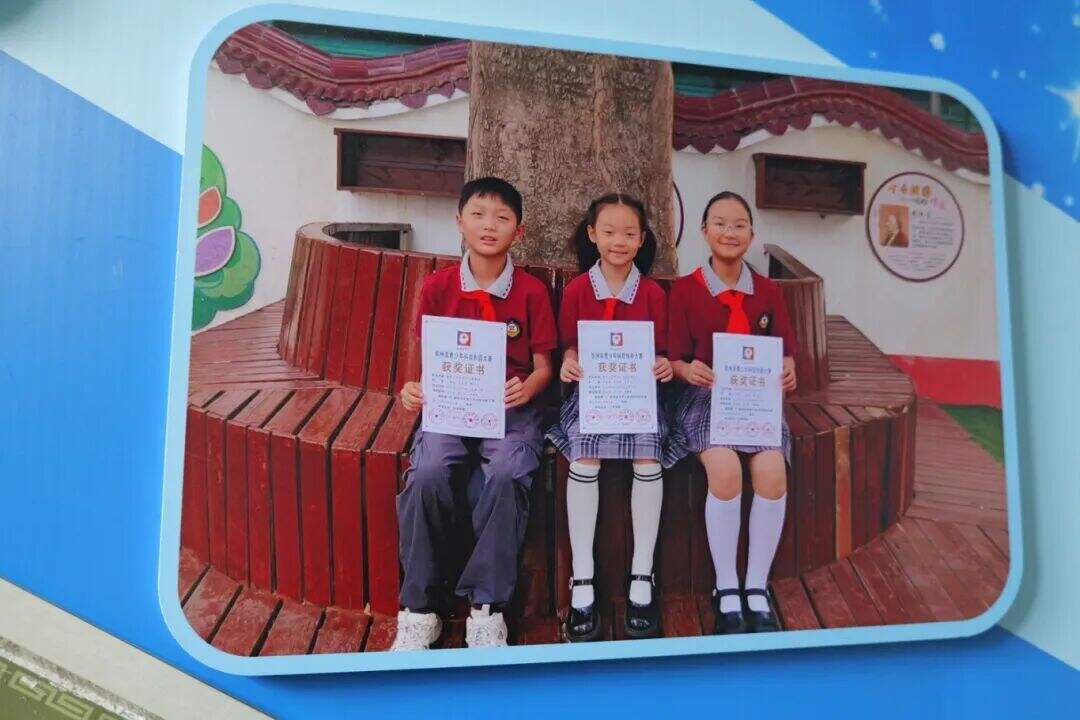 在学校的走廊上,有一张这样的合影,三位学生手持获奖证书坐在皂荚树下,那时,他们刚刚在郑州市青少年科技创新大赛中获得一等奖。这棵皂荚树,也是他们展示自己科技成果的起点。