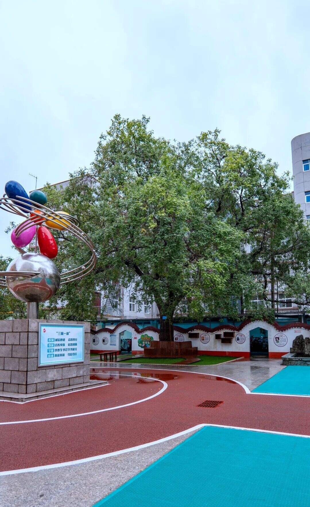 这棵200多岁的“树爷爷”,学校采取了各种保护措施,不仅设置保护性围栏和栈道,避免根部土壤被过度踩踏,还邀请园林专家对它进行“体检”,防治病虫害,定期修剪古树的枯枝。这些措施既确保孩子们能安全地与古树亲密接触,也将守护它的责任传递到每一位学生手中。