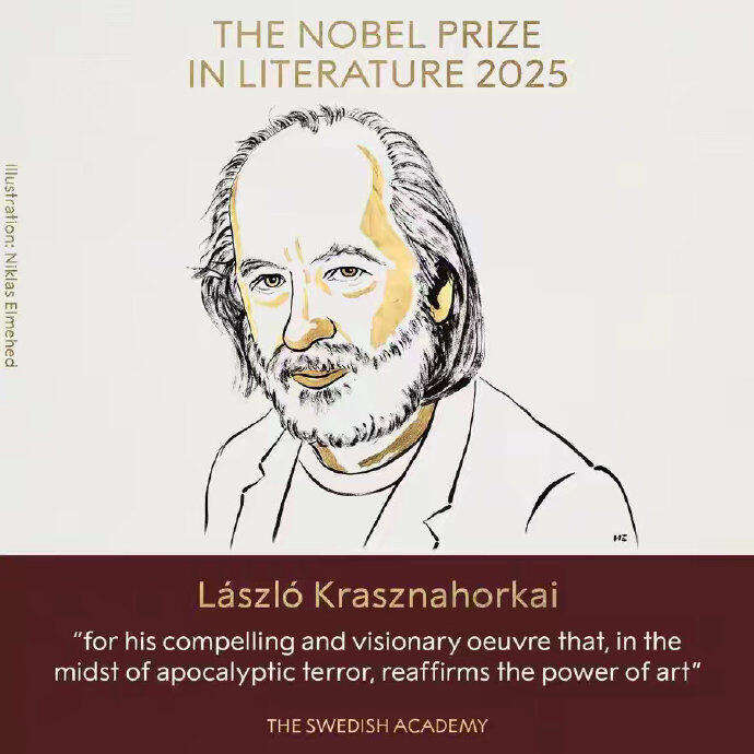 瑞典斯德哥尔摩当地时间2025年10月9日13:00(北京时间19:00),瑞典学院将2025年诺贝尔文学奖颁给了匈牙利作家拉斯洛·卡撒兹纳霍凯。