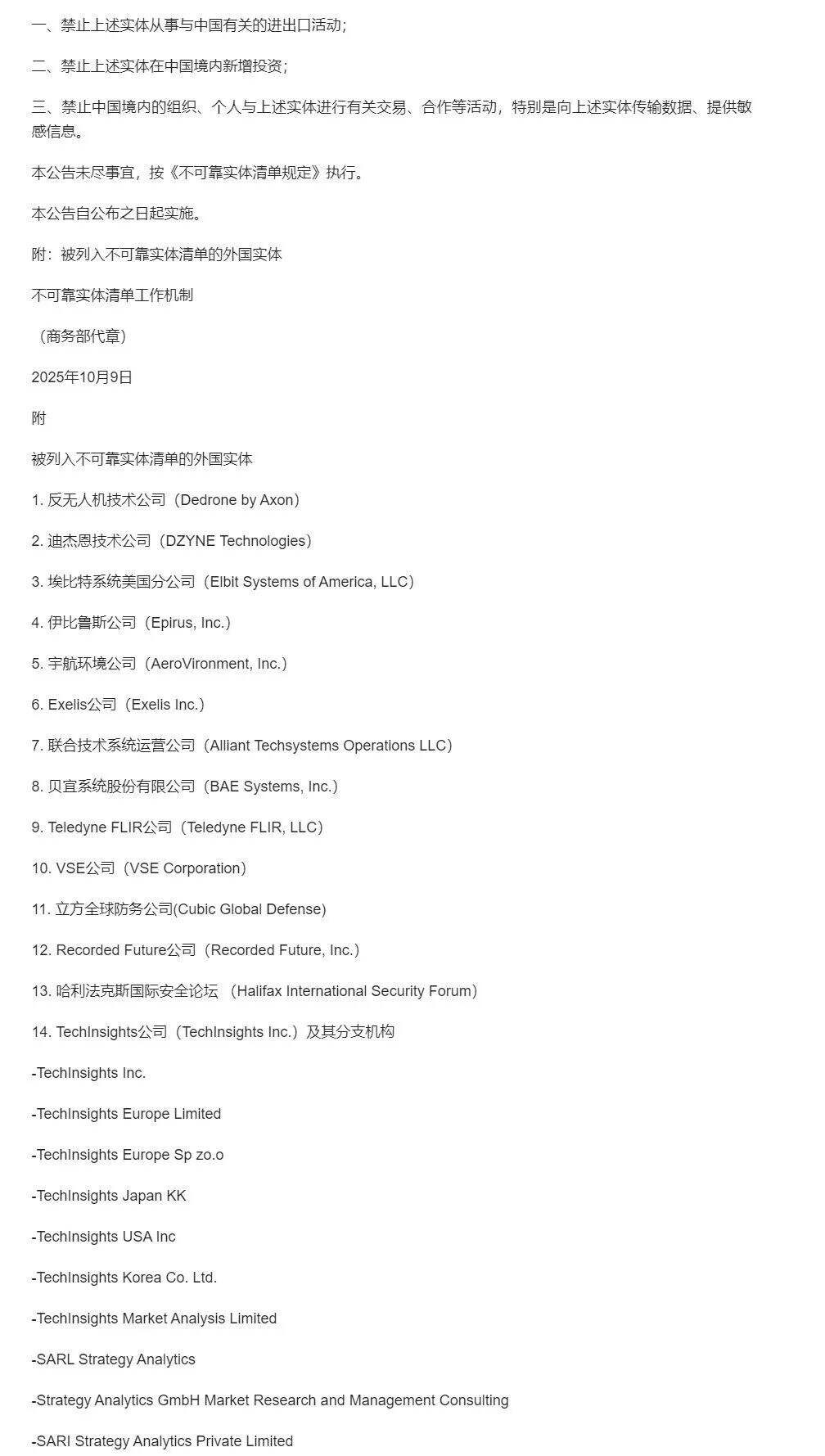 10月9日,商务部网站发布公告,为维护国家主权、安全和发展利益,根据《中华人民共和国对外贸易法》《中华人民共和国国家安全法》《中华人民共和国反外国制裁法》等有关法律,不可靠实体清单工作机制依据《不可靠实体清单规定》第二条、第八条和第十条等有关规定,决定将反无人机技术公司、TechInsights公司及其分支机构等外国实体列入不可靠实体清单,并采取以下处理措施: