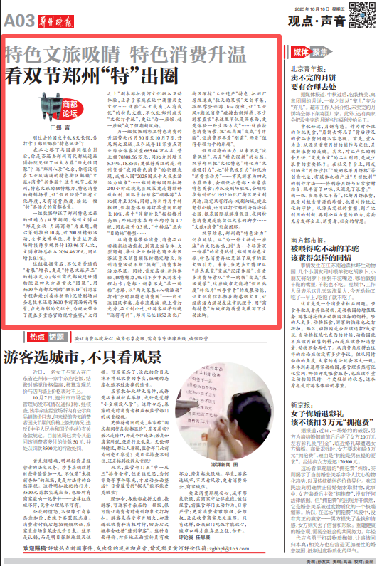 双节结束,郑州的“特色活力”仍在延续。从“为一件文物赴一座城”的文化共鸣,到“为一个场景买一份单”的消费热情,郑州用特色文旅、特色消费再次见证了城市的巨大吸引力。未来,当更多文博IP从“静态展览”变成“沉浸体验”,当更多消费场景从“单一购物”变成“生活美学”,这座城市定能将“假日热度”转化为“四季常青”的发展动能,让文化自信扎根在街巷烟火里,让经济活力涌动在城市肌理中,用“商都特色”为城市高质量发展写下生动注脚。