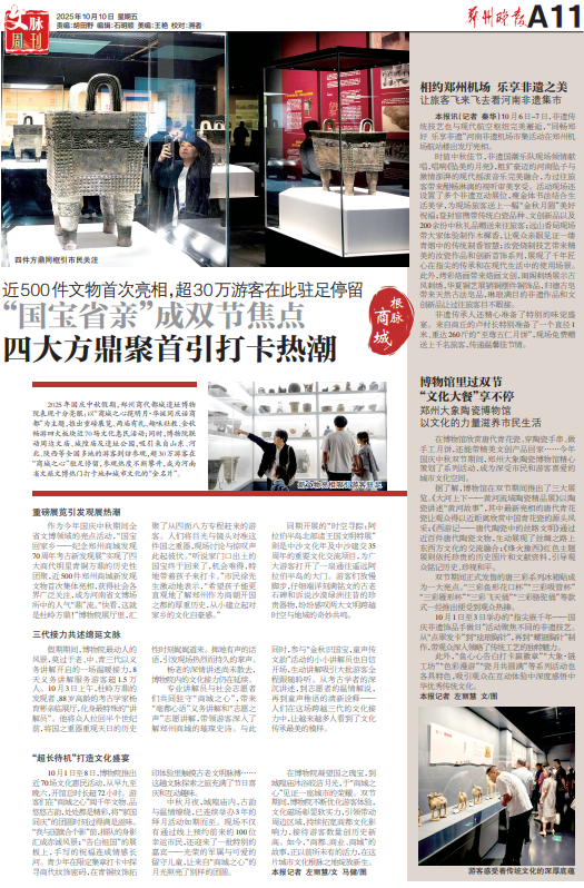 作为今年国庆中秋期间全省文博领域的亮点活动,“国宝回家乡——纪念郑州商城发现70周年考古新发现展”实现了四大商代明星青铜方鼎的历史性团聚,近500件郑州商城新发现文物首次集体亮相,获得社会各界广泛关注,成为河南省文博场所中的人气“鼎”流。“快看,这就是杜岭方鼎!”博物院展厅里,汇聚了从四面八方专程赶来的游客。人们将目光与镜头对准这件国之重器,现场讨论与惊叹声此起彼伏。“听说家门口出土的国宝终于回来了,机会难得,特地带着孩子来打卡。”市民徐先生激动地表示,“希望孩子能更直观地了解郑州作为商朝开国之都的厚重历史,从小建立起对家乡的文化自豪感。”