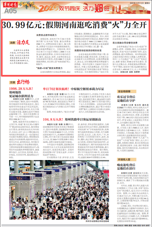 全省多地通过“商业+文化+旅游”资源整合,把单一的购物、观光、文化体验串联起来,形成“吃住行游娱购”闭环,延长消费链条、提升消费体验。郑州等旅游热点城市将地方特色元素融入消费场景。郑州二七万达推出“‘食’力全开”美食活动,亳都·新象汇聚60余家知名餐饮、零售与生活集合店,多维度重构消费场景。“双节”期间,省商务厅重点监测的餐饮企业营业收入4503.02万元,比上年同期增长14%。
