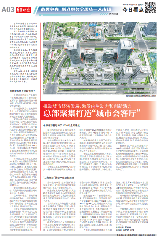 总部经济作为推动城市经济发展的重要引擎,不断激发着郑州的内生动力和创新活力。