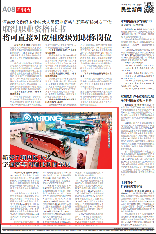 在这场盛会上,中国客车品牌宇通携高端纯电动车型及多项前沿技术亮相,并一举斩获“年度最佳客车大奖”“年度最佳巴士大奖”等7项Busworld大奖,创下迄今中国客车品牌参评Busworld获奖数量的最高纪录。其中,年度最佳客车大奖和年度最佳巴士大奖,均为中国客车品牌在Busworld首次获得,再次为中国制造赢得荣光。