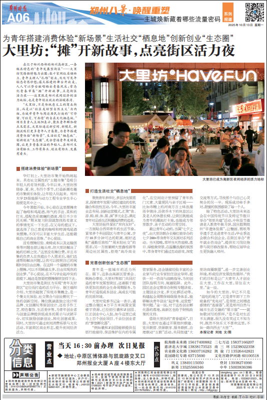 在位于郑州西部的郑州高新区,一条极具特色的“青年发展型街区”——大里坊凭借独特魅力出圈:数十家网红店铺林立、青年主理人“扎堆”创业,处处可见年轻态奇思妙想;露天搭建的舞台开放麦,人人可以登台献唱晒出青春风采;常态化青春市集“摊”开新故事,点亮街区活力夜……这里既是郑州夜间经济的活力地标,也是青年创业就业的温暖港湾。