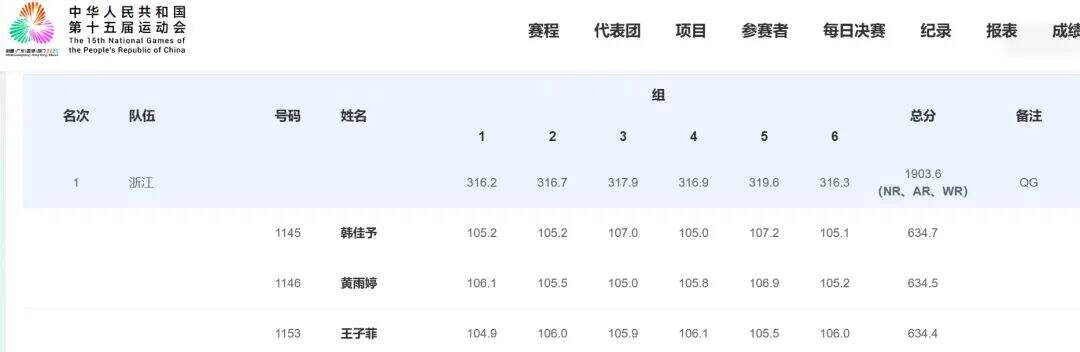 13日,在第十五届全国运动会女子10米气步枪资格赛中,由王子菲、黄雨婷、韩佳予组成的浙江队打出了1903.6环的总成绩,超过了中国队在2025年射击亚锦赛中创造的1902.0环的团体世界纪录。