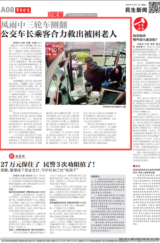 雨中一辆电动三轮车不慎侧翻,两位老人困于车内……公交车长与乘客合力上演了一场既救人也暖心的紧急援助。10月12日早上7点,郑州公交S113路党员车长常运好正驾驶车辆在雨中平稳前行。行至博体路与玉轩路交叉口时,他看到前方一辆三轮车侧翻在地,地上散落着碎玻璃和物品,车内有一只手在不停晃动。意识到车内有人求救,他迅速将公交车停靠在安全地带,并向车内乘客简要说明情况后,便第一个冲向侧翻的三轮车。