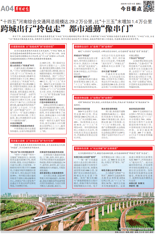 昨日下午,省政府新闻办召开河南省高质量完成“十四五”系列主题新闻发布会(第十场),介绍河南“十四五”时期奋力建设交通强省有关情况。“十四五”以来,全省“121”便捷出行格局基本形成,实现郑州与省辖市1小时通达、郑州与周边省会城市2小时通达、县城至所辖乡镇1小时通达,交通强省建设迈出坚实步伐。