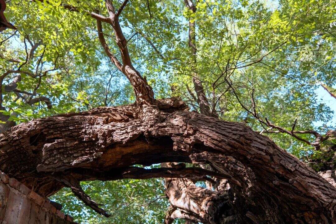 “你看它的树干多粗,还有这里,这个粗树枝看着好像已经断开了,可是上面的树叶还是鲜活的”,新郑市林业局工作人员胡展指着架在旁边院墙的树枝说,“如今,这所院子里已经不住人了,也为大槐树腾出了生长的空间。”