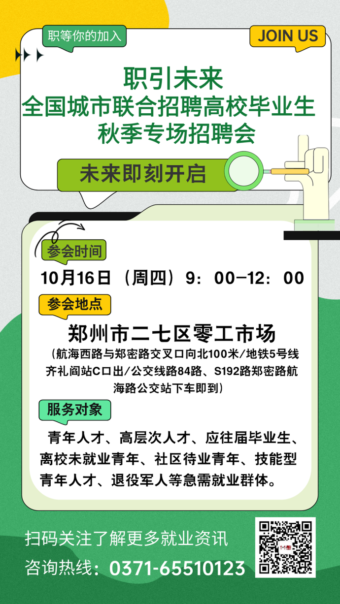 “职引未来——全国城市联合招聘高校毕业生秋季专场招聘会”将于10月16日(周四)上午在郑州市二七区零工市场举办,届时提供5500余个就业岗位。
