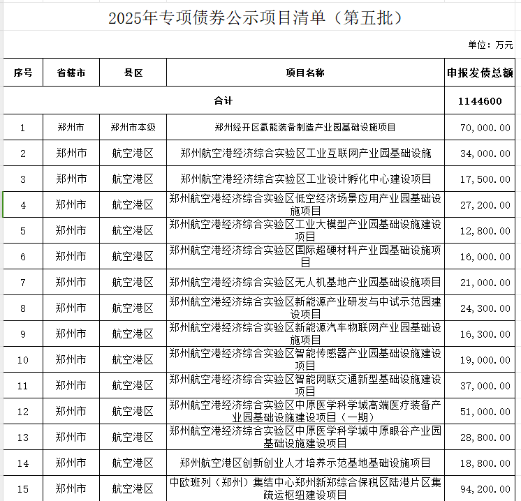 日前,河南省财政厅发布2025年专项债券公示项目清单(第五批),申请发债总额114.46亿元!涉及两个胖东来项目,申报发债总额16亿元。