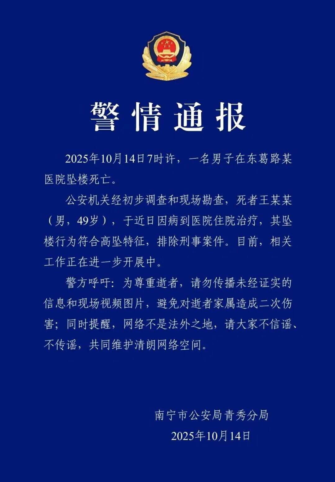 10月14日,广西南宁警方通报“一男子医院坠亡”:王某某(男,49岁)因病住院治疗,其坠楼行为符合高坠特征,排除刑案。