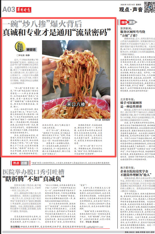 一碗“炒八掺”掺了不少巧思。草根爆红也好,算法造星也罢,“剧本”无它,唯有真诚和专业才是通用的“流量密码”。