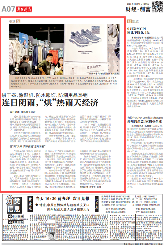 刚晒了两天太阳,雨水就又来“打卡”了!入秋后,郑州与众多城市一样,切换成了绵绵不绝的雨季模式,晴好天气只是短暂“客串”。随之而来的出行不便、衣物难干等问题,也困扰着不少市民。而与持续雨水模式同步的,还有悄然兴起的雨天经济。不少市民主动选购防水、防潮用品,以应对不时之需;商家也适时调整营销策略,展现出因“雨”而动的市场活力。