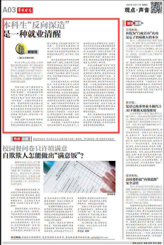 由此来看,一些本科生选择通过职业教育提升自己的竞争力,以更好适应就业市场的变化,体现了当代大学生对自我发展的理性思考以及对市场需求的敏锐洞察。看似是“反向选择”,实际上是作出了有利于自己职业发展的选择。这对缓解就业市场“内卷”、满足用工单位需求、推动制造业高质量发展有积极意义,可谓是一举多得。