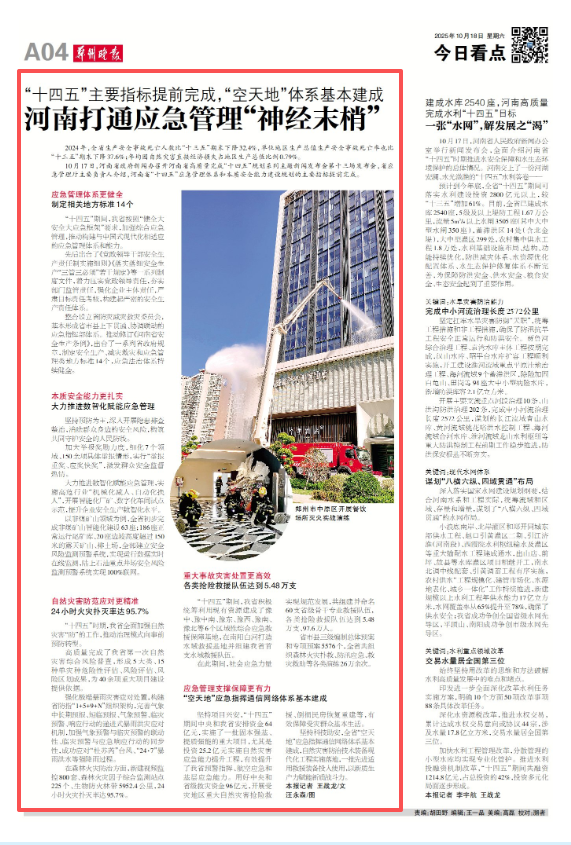 10月17日,河南省政府新闻办召开河南省高质量完成“十四五”规划系列主题新闻发布会第十三场发布会,省应急管理厅主要负责人介绍,河南省“十四五”应急管理体系和本质安全能力建设规划的主要指标提前完成。