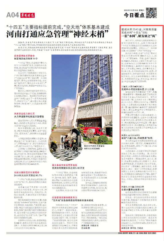 预计到今年底,全省“十四五”期间可落实水利建设投资2800亿元以上,较“十三五”增加61%。目前,全省已建成水库2540座,5级及以上堤防工程1.67万公里,流量5m3/s以上水闸3505座(其中大中型水闸350座),蓄滞洪区14处(含北金堤),大中型灌区299处,农村集中供水工程1.8万处,水利基础设施布局、结构、功能持续优化,防洪减灾体系、水资源优化配置体系、水生态保护修复体系不断完善,为保障防洪安全、供水安全、粮食安全、生态安全起到了重要作用。