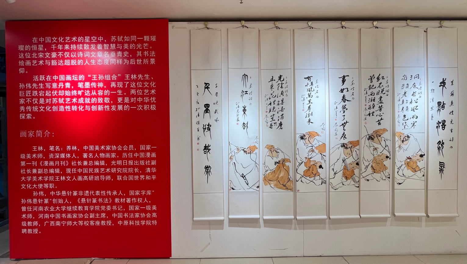 此次巡展曾于8月16日至9月30日在郑州美术馆展出,引起观众热烈反响。此次在京展出百余幅佳作,通过多元艺术形式的交响与丰富内容维度的展开,成功构建了一个丰富立体的东坡艺术世界,使观众得以从不同角度感受苏轼的人格魅力与艺术成就。王林用写意中国画的传神之笔再现了苏轼的艺术形象,孙伟将非遗悬针篆文化与苏东坡文化巧妙融合书写苏东坡诗词名句,两位艺术家珠联璧合,笔墨丹青,写意传神,再现了苏东坡这位文化巨匠跌宕起伏却始终旷达从容的一生,带观众领略东坡文化的博大精深。