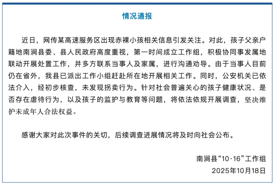 10月18日,云南南涧县“10·16”工作组就“网传某高速服务区出现赤裸小孩”一事发布情况通报:公安机关依法介入调查“高速赤裸小孩”,初步核查未发现拐卖行为,将对孩子健康状况、是否存在虐待行为等开展调查。