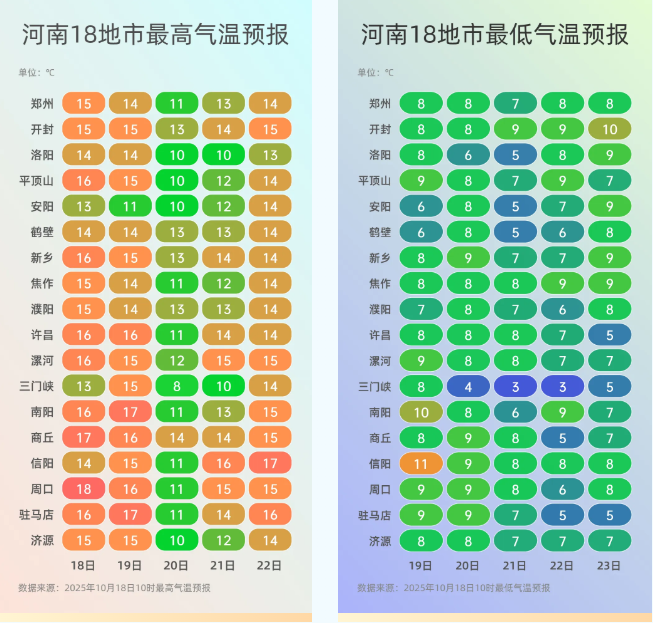据河南气象,18日下午至19日白天全省大部雨水间歇,仅西部、南部有小雨;19日夜里至20日,沿黄及以南有小雨,西部高海拔山区有雨夹雪;21日转晴。同时冷空气持续影响,19日~20日,气温下降8℃左右,20日全省大部最高温10℃出头,西部部分地区甚至不足10℃。最低气温将逐渐跌至谷底,仅有5℃~7℃,多地将迎今年下半年来最冷早晨。20日凌晨西部山区还将出现初霜冻。
