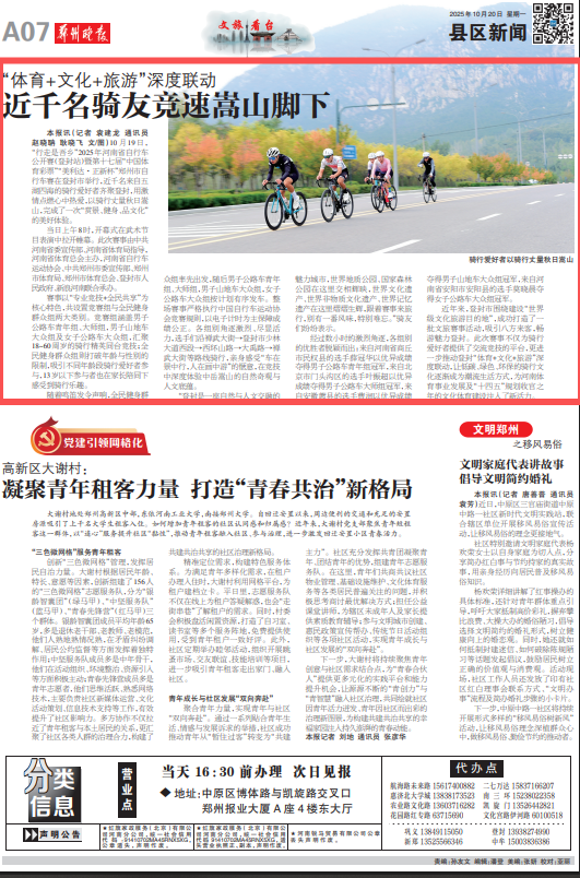 10月19日,“行走是吾乡”2025年河南省自行车公开赛(登封站)暨第十七届“中国体育彩票”“美利达?正新杯”郑州市自行车赛在登封市举行,近千名来自五湖四海的骑行爱好者齐聚登封,用激情点燃心中热爱,以骑行丈量秋日嵩山,完成了一次“赏景、健身、品文化”的美好体验。