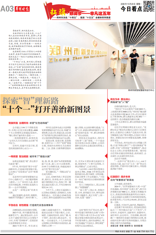 “十四五”以来,郑州深入贯彻落实习近平总书记关于城市治理的重要论述,以“扛旗”姿态创新实践,推进党建引领网格化基层高效能治理,探索出一条超大特大城市智慧高效治理的新路子,“一核统多元、一格管全面、一屏观全域、一网揽全局、一线通上下、一键全处理、一融助创新、一文促善治、一法保平安、一制强安全”的“十个一”治理新格局让社会治理难点变为群众幸福支点,在中原大地熠熠生辉。