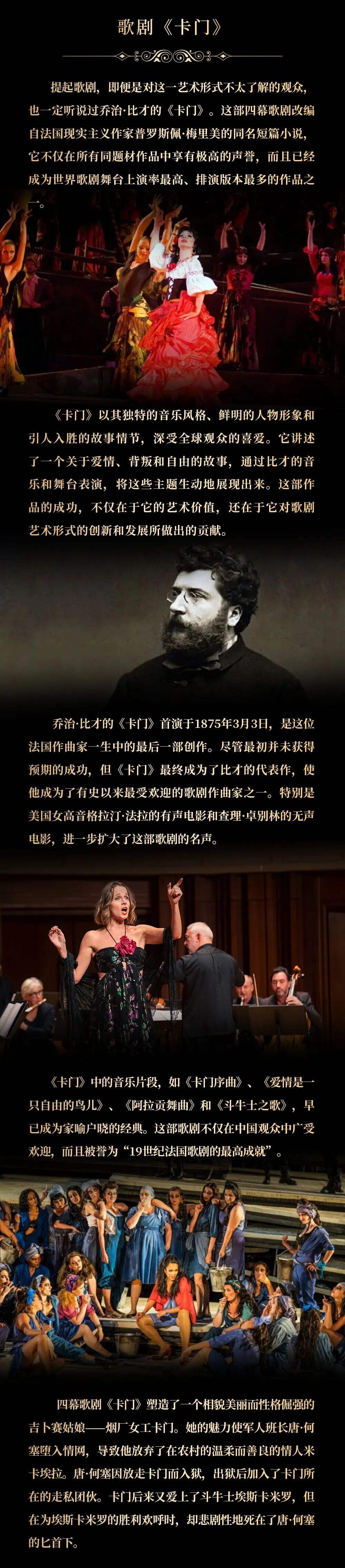 《卡门》中的音乐片段,如《卡门序曲》《爱情是一只自由的鸟儿》《阿拉贡舞曲》和《斗牛士之歌》,早已成为家喻户晓的经典。这部歌剧不仅在中国观众中广受欢迎,而且被誉为“19世纪法国歌剧的最高成就”。
