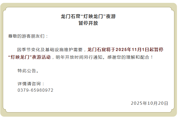 因季节变化及基础设施维护需要,洛阳龙门石窟将于11月1日起暂停“灯映龙门”夜游活动,明年开放时间另行通知。