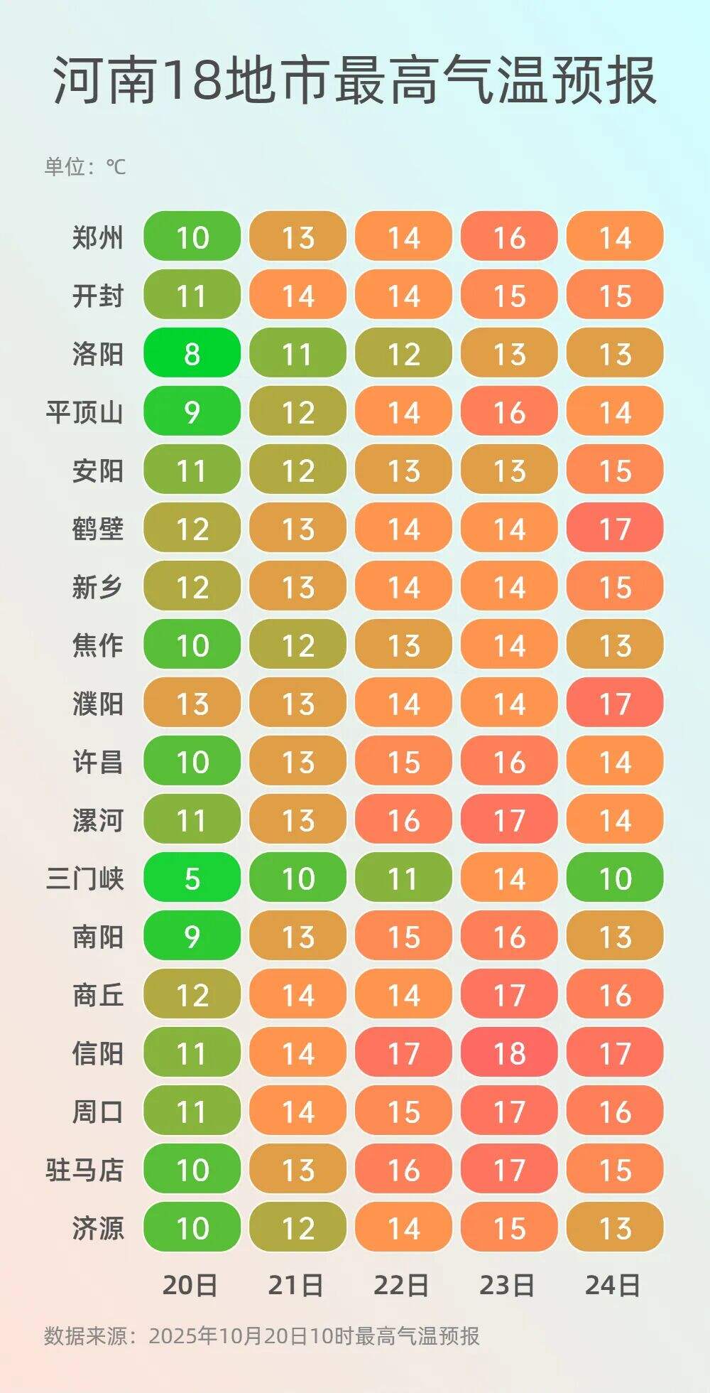 10月20日至21日,冷空气持续影响中东部,多地气温再降4℃~8℃(局地 10℃),南方多地创今年下半年气温新低。大城市中,郑州今天最高气温仅有10℃,济南、合肥等地也将不足15℃,纷纷创下今年下半年以来最高气温新低,华北开启入冬、江南全面入秋,21日起长江以北逐步升温,22日起江南华南跟进。
