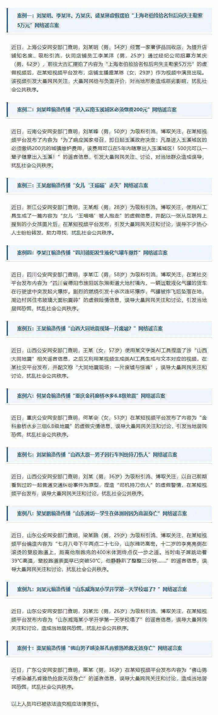 今日,公安部公布10起打击整治网络谣言典型案例↓↓↓