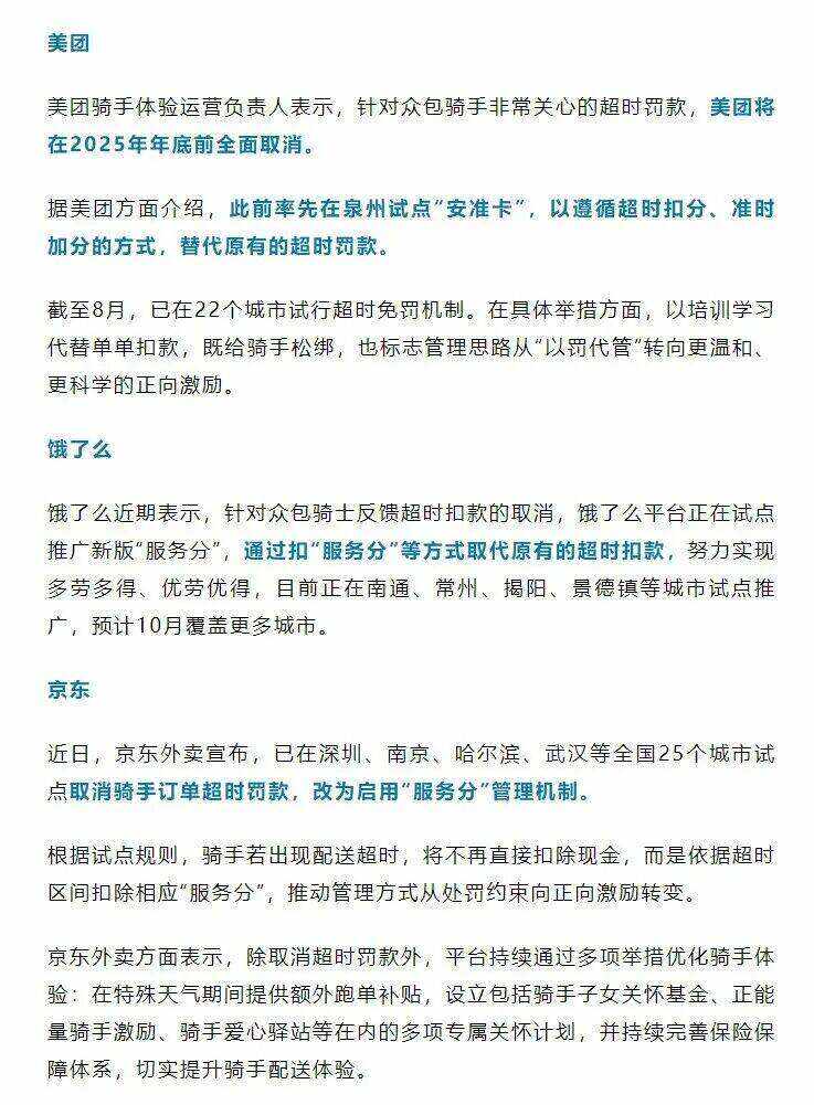 三大外卖平台近日宣布,取消骑手超时罚款。