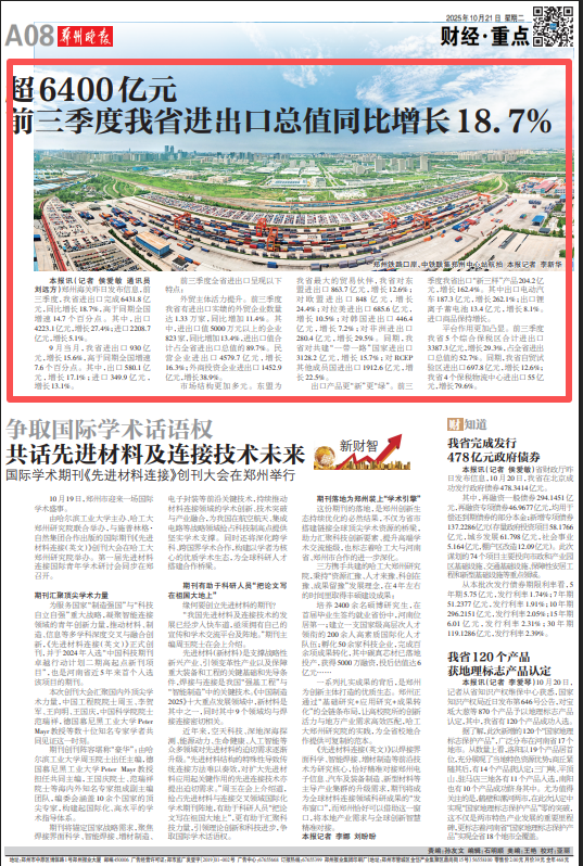 郑州海关昨日发布信息,前三季度,我省进出口完成6431.8亿元,同比增长18.7%,高于同期全国增速14.7个百分点。其中,出口4223.1亿元,增长27.4%;进口2208.7亿元,增长5.1%。