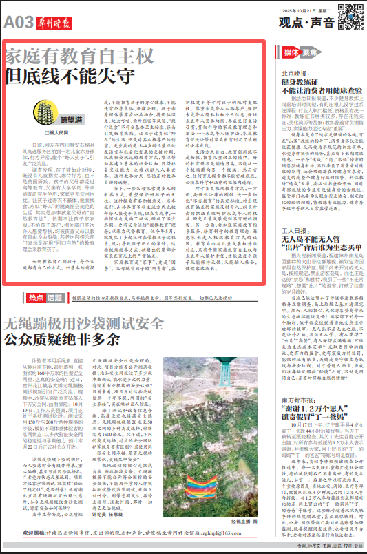 家庭教育是“家事”,更是“国事”。父母绝非孩子的“所有者”,监护权更不等于对孩子的绝对支配权。尊重未成年人人格尊严,保护未成年人隐私权和个人信息,保证未成年人营养均衡、养成良好生活习惯,贯彻科学的家庭教育理念和方法……未成年人保护法、家庭教育促进法等对家庭教育划定了清晰的法律底线。