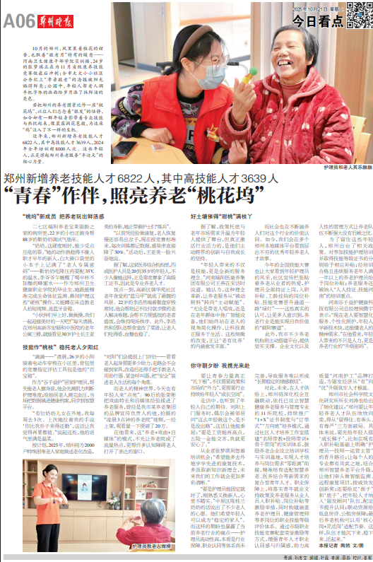 若把郑州的养老图景比作一座“桃花坞”,以往人们总念着“银发”的恬静,如今却有一群年轻身影带着专业技能与热忱赶来,像晨露润花苞般,为这座“坞”注入了不一样的生机。