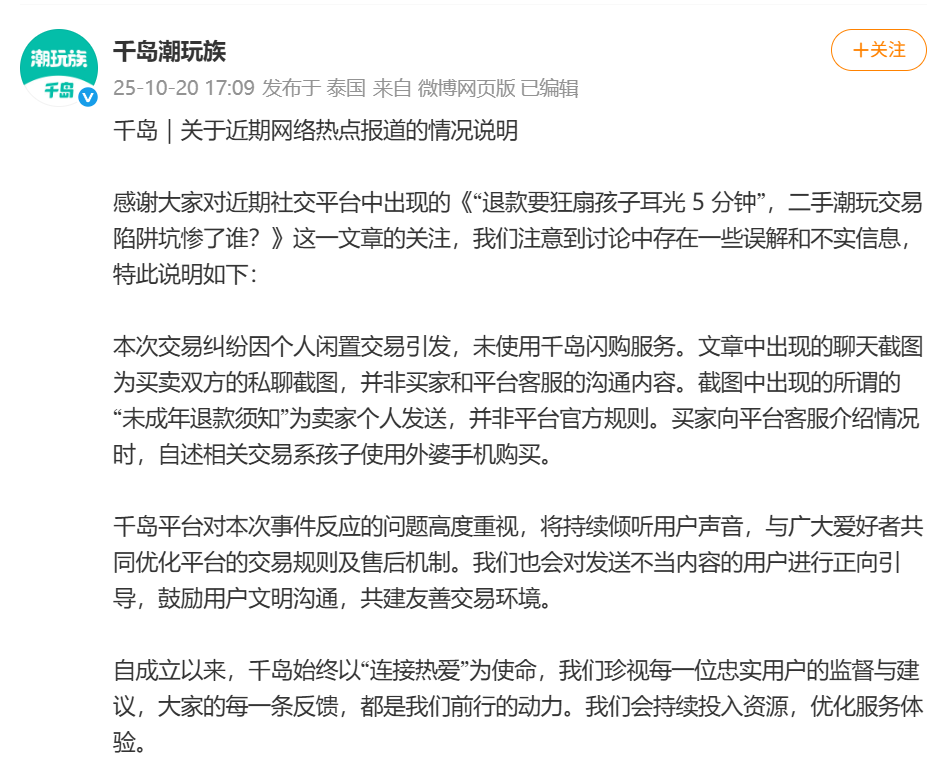 近日,11岁女孩花500多元在潮玩交易平台千岛上买卡牌,家长称退款时被卖家要求扇孩子耳光5分钟,对此,千岛平台回应,纠纷源于个人闲置交易,涉事“须知”是卖家个人行为,非平台规则,将引导涉事用户并优化售后。