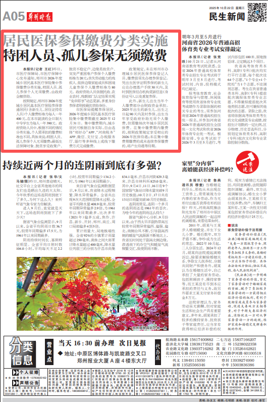 昨日,市医疗保障局、市医疗保障中心发布通知,郑州市2026年度城乡居民基本医疗保险集中参保缴费分类实施,特困人员、孤儿参保个人无须缴费,由政府全额资助。