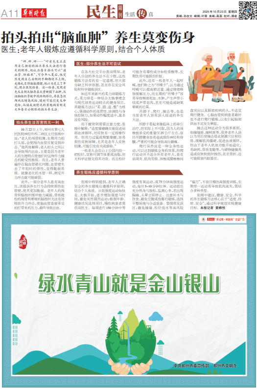 张刚中特别提到,老年人正确安全的养生锻炼应遵循科学原则,结合个人体质。从低强度运动如快走、太极开始,逐步增加强度与时间,避免突然剧烈运动;根据年龄、健康状况选择项目,慢性病患者需咨询医生。每周进行150分钟中等强度有氧运动,或75分钟高强度运动,每日5~10分钟拉伸。运动前后充分热身与放松,监测心率,若出现胸痛、头晕立即停止。注意补水与饮食,避免空腹或饱餐后锻炼,选择平整场地与合适装备。警惕常见误区:避免撞墙、松针泡水等高风险“偏方”,不盲目模仿高强度训练,长期单一运动易导致肌肉流失,需结合多种类型。