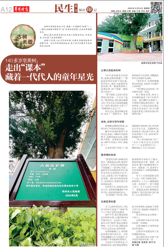 在郑州管城区南关小学,藏着一个温暖的“秘密”——一棵从全国语文课本中“走”出来的皂荚树,正在这里静静生长。