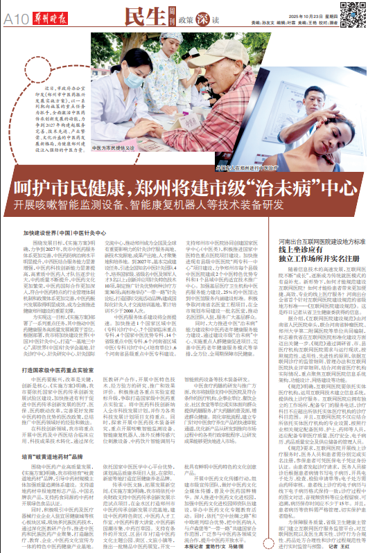 围绕发展目标,《实施方案》明确,力争到2027年,我市中医药服务体系更加完善,中医药防病治病水平明显提升,中西医结合服务能力显著增强,中医药科技创新能力显著提高,高素质中医药人才队伍逐步壮大,中药质量不断提升,中医药文化更加繁荣,中医药国际合作更加深入,符合中医药特点的行业管理体制机制和政策体系更加完善,中医药振兴发展取得明显成效,成为全面推进健康郑州建设的重要支撑。