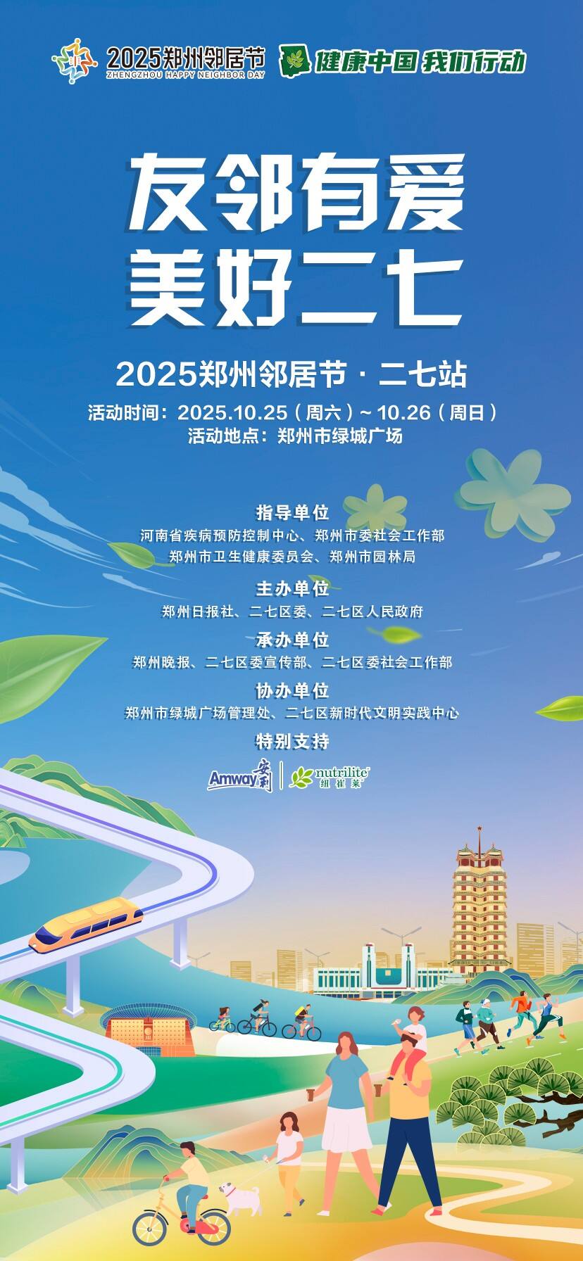家人们!郑州人专属的邻里狂欢要来了!10月25日~26日,绿城广场将变身 “邻里欢乐场”——郑州邻居节二七站暨“健康中国 我们行动”郑州站活动重磅回归啦!