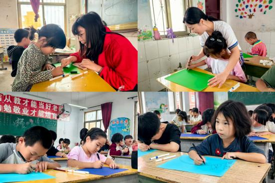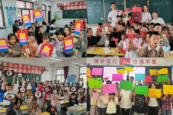 美术课则成为孩童表达情感与理想的重要载体。志愿者首先引导学生以“秋天的故事”为主题创作丙烯画,此外,学生们还通过折纸的形式共同创作了一副感恩之作,画上的每个小心心上都有孩子稚嫩笔记写下的名字,这份朴素真挚的感恩之情,正是平安银行坚持公益支教的核心动力:企业社会责任不仅体现于物质帮扶,更在于以实际行动传递温暖,让受助者感受社会关怀,进而培养感恩之心与社会责任感。国庆临近之际,志愿者又带领孩子们创作以五星红旗为背景的画作,当黄色颜料点染出五角星的璀璨光泽时,孩子们齐声说道“要把画献给祖国妈妈”。在支教中融入爱国主义教育,引导乡村孩童增强国家认同感与民族自豪感,既是平安银行践行社会责任与时代使命的重要体现,也让支教意义更趋深远。