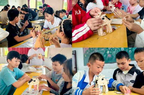 9月5日,首批志愿者肩负使命,携两大箱教具物资启程。行至路程中段时,天空下起大雨,而抵达目的地时,希望小学校长已撑伞等候。简单安顿后,志愿者即刻投入教学工作。科技手工课上,动手能力极强的李老师手持电动泡泡机零件,以“红色导线接正极、黑色导线接负极”的通俗讲解,将抽象电路知识转化为直观实践操作。孩子们围坐桌前,专注组装零件。当五年级学生尹文卓成功让泡泡机转动时,兴奋地高呼“泡泡像秋天的小灯笼”,课堂内瞬间响起阵阵欢笑——这正是知识点亮童心的生动回响。这堂科技课不仅让乡村孩童接触基础科学原理,更在其心中播下探索创新的种子,而这亦是平安银行借支教传递“智志双扶”理念的初衷:不仅为乡村教育补充资源,更助力孩子们拓宽视野、树立远大理想。