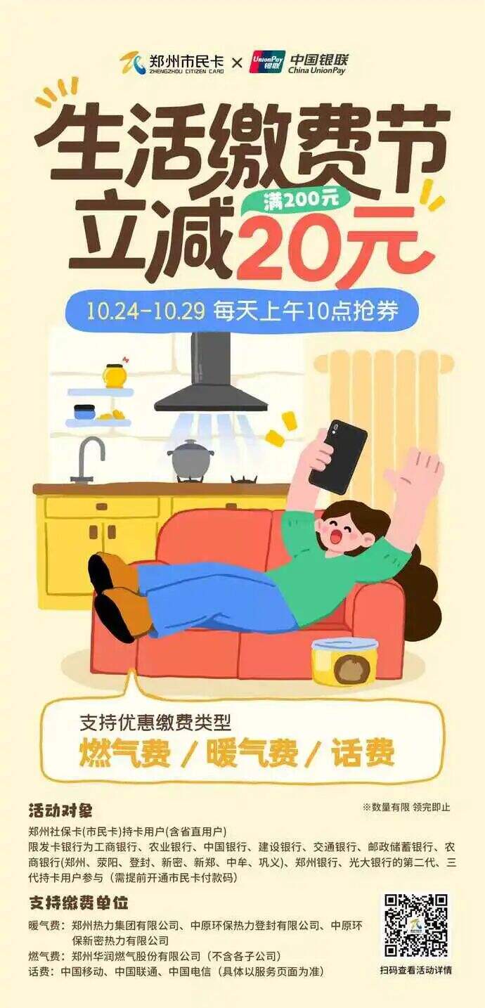 10月24日至29日,郑州社保卡(市民卡)联合中国银联开展“2025年生活缴费节”活动。每天上午10点,用户可登录郑州市民卡APP领取20元优惠券,缴纳燃气费、暖气费、话费满200元可核销,数量有限。