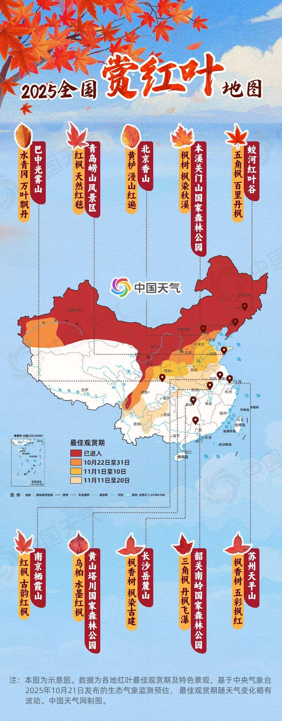 时值霜降,我国长江以北地区秋意已浓,秋的前沿已抵达江南南部一带。随着气温走低,各地秋叶逐渐变色,赏红叶的最佳时节到了。2025全国赏红叶地图出炉,看看哪些地方即将进入最佳观赏期,还有十大赏红叶胜地的特色景观推荐,带你开启一场赏红叶之旅。