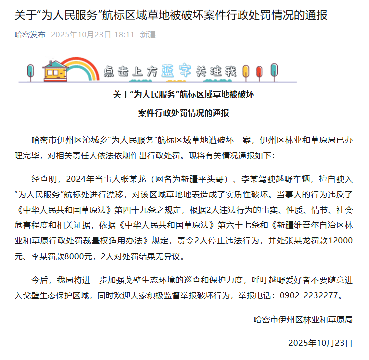10月23日,新疆哈密市伊州区林业和草原局发布关于“为人民服务”航标区域草地被破坏案件行政处罚情况的通报:张某龙罚款12000元、李某罚款8000元,2人对处罚结果无异议。