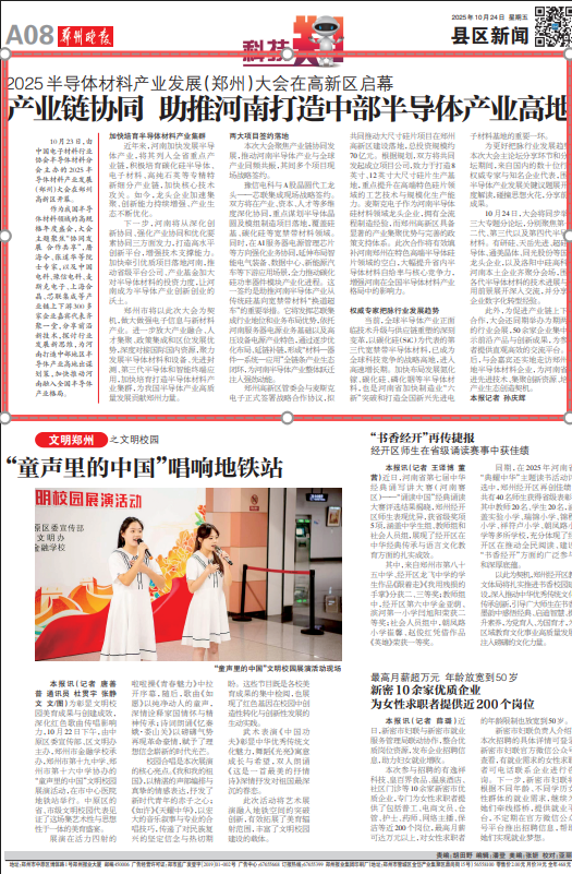 10月23日,由中国电子材料行业协会半导体材料分会主办的2025半导体材料产业发展(郑州)大会在郑州高新区开幕。